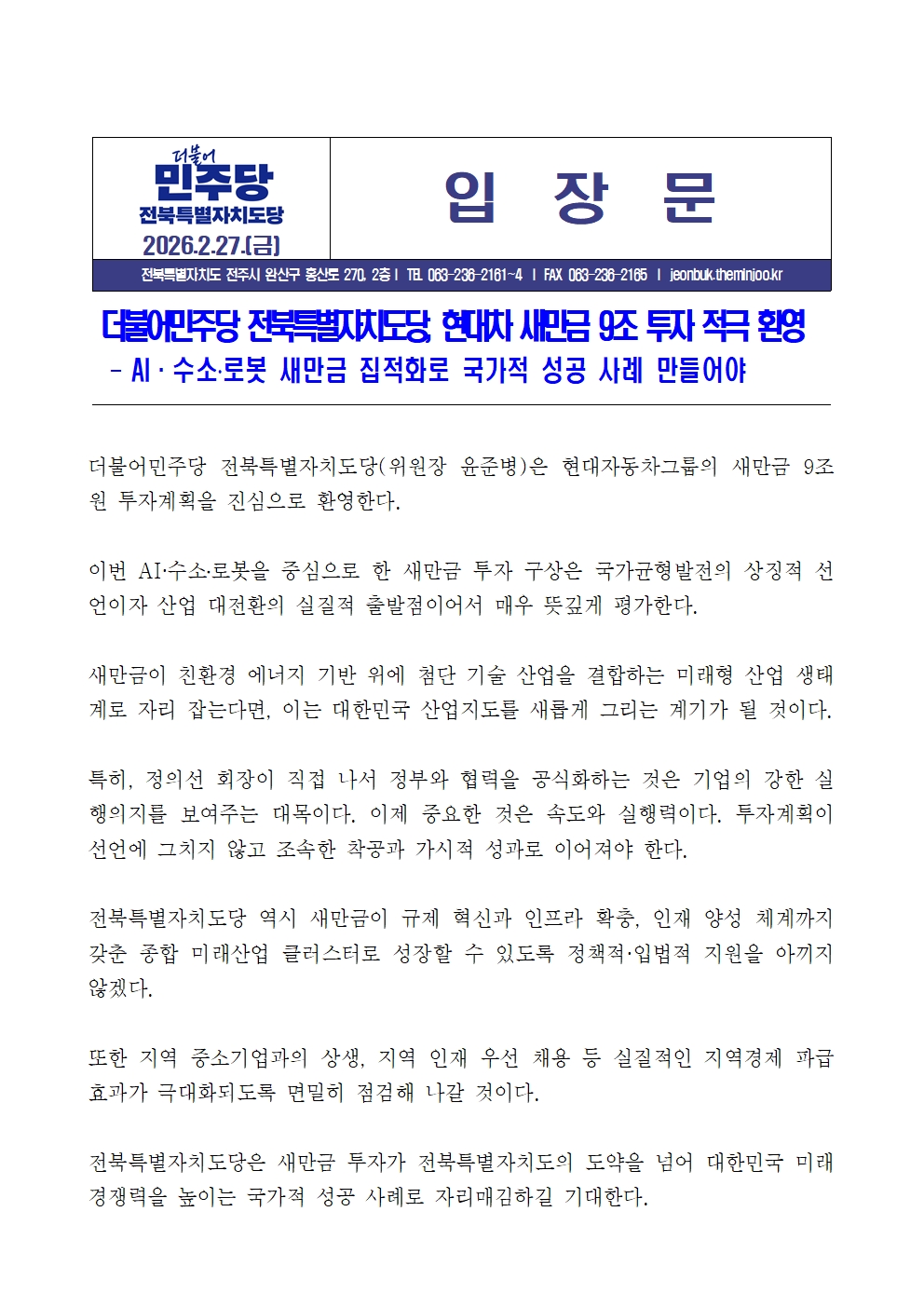 260227[입장문]더불어민주당 전북특별자치도당, 현대차 새만금 9조 투자 적극 환영