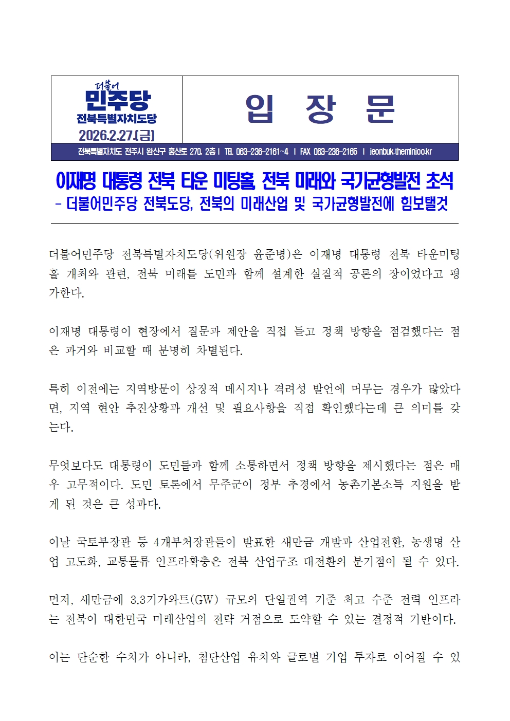 260227[입장문]이재명 대통령 전북 타운 미팅홀, 전북 미래와 국가균형 발전 초석