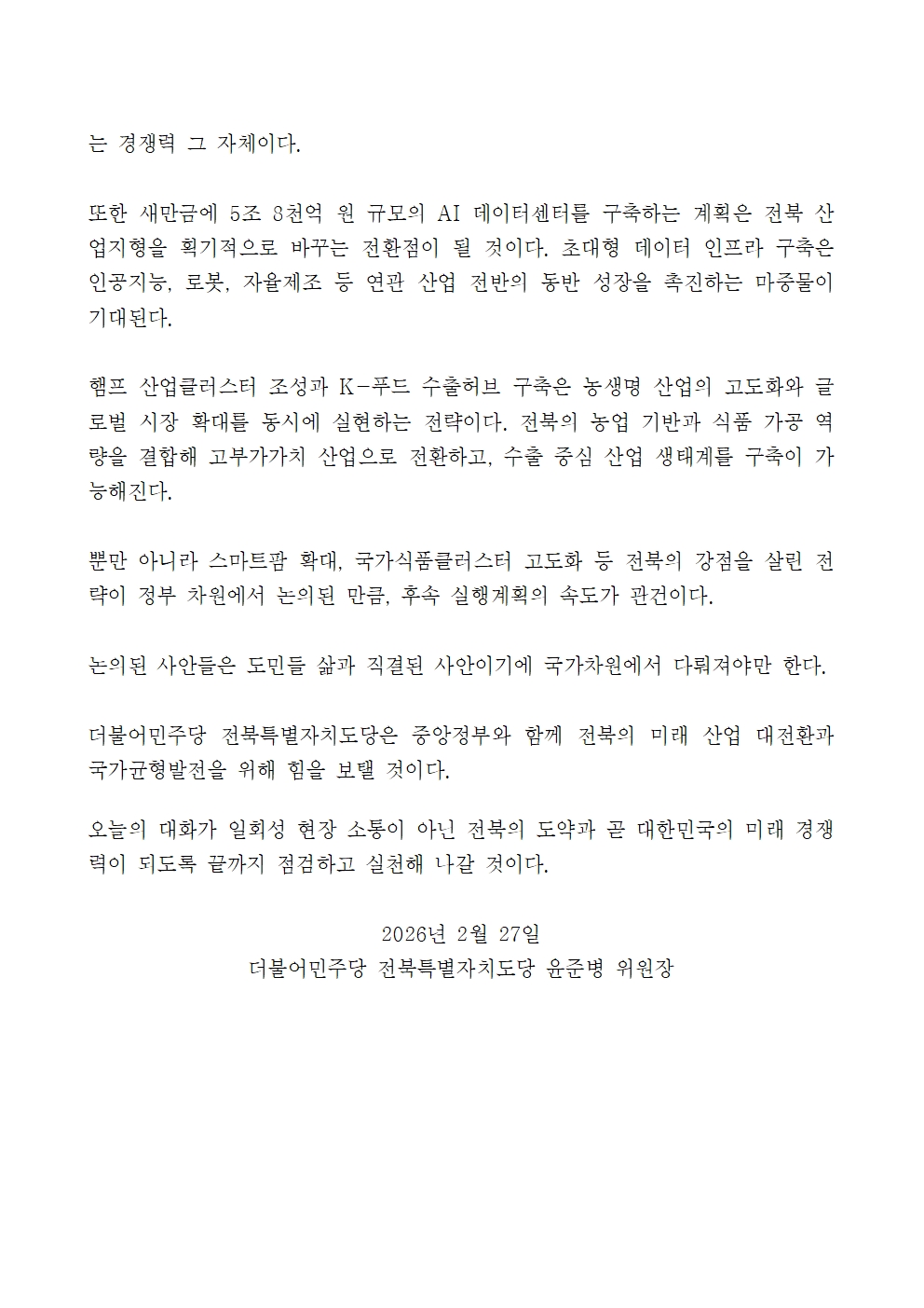 260227[입장문]더불어민주당 전북특별자치도당, 현대차 새만금 9조 투자 적극 환영