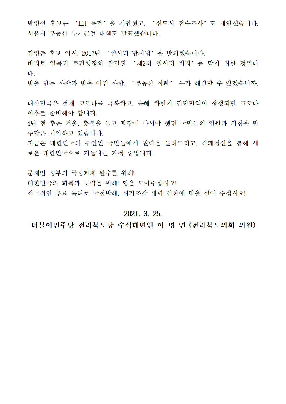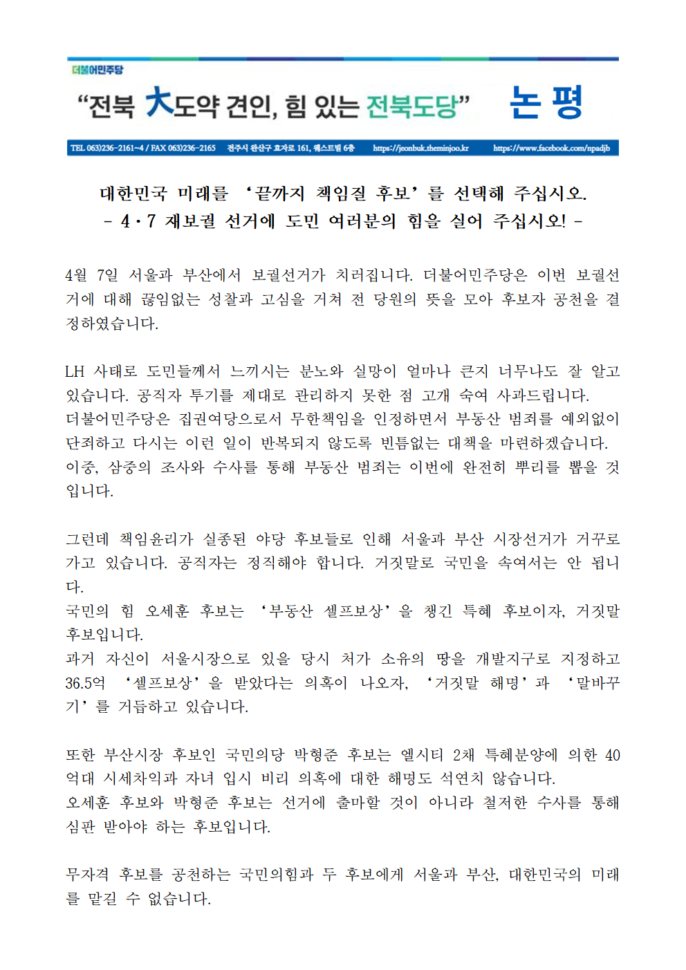 [논평] 4·7 재보궐 선거에 도민 여러분의 힘을 실어 주십시오!
