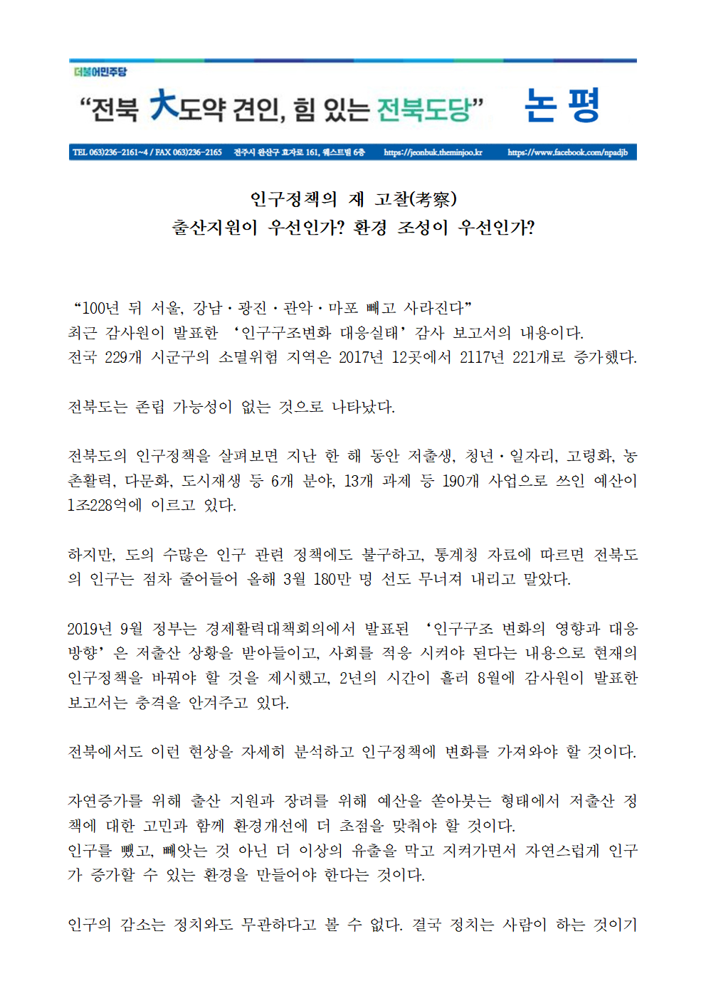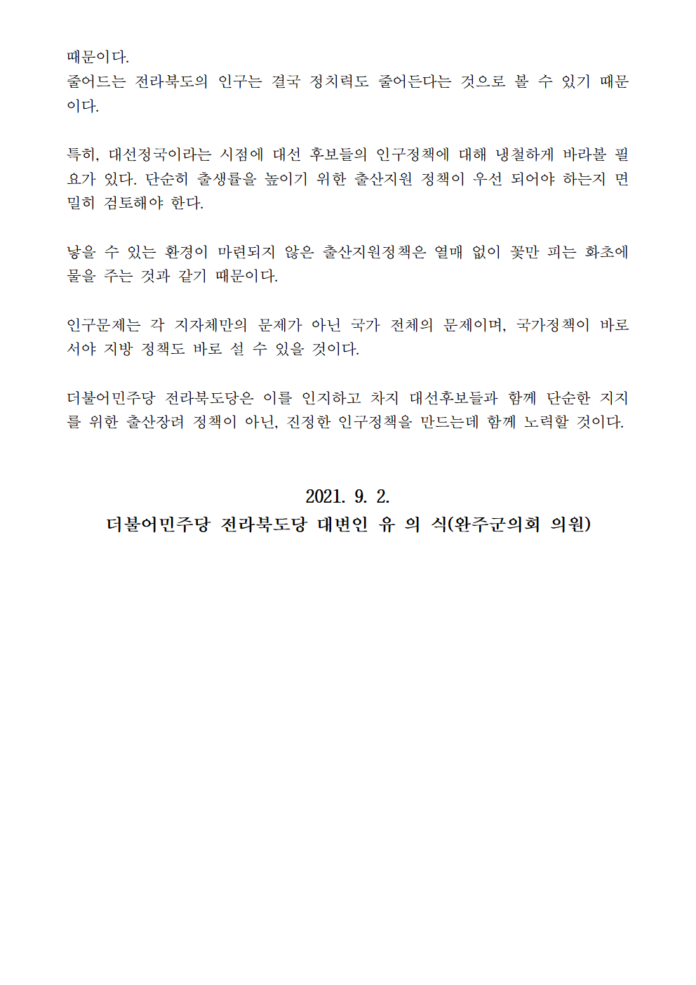[논평] 출산지원이 우선인가? 환경 조성이 우선인가? - 유의식 대변인(완주군의회 의원)